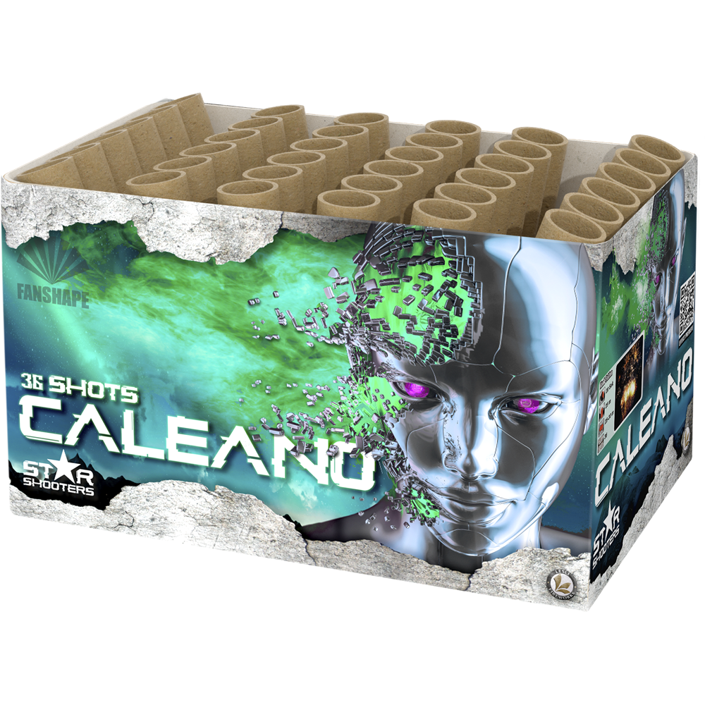 Caleano n nExtreem brede, knetterende batterij met 36 schoten in waaiervorm. Enkelvoudige verpakking n nKaliber 25 nAantal schoten 36 nBrand duur 20 Seconden Caleano Goedkoop vuurwerk kopen bij Vuurwerkwinkel Emmerich