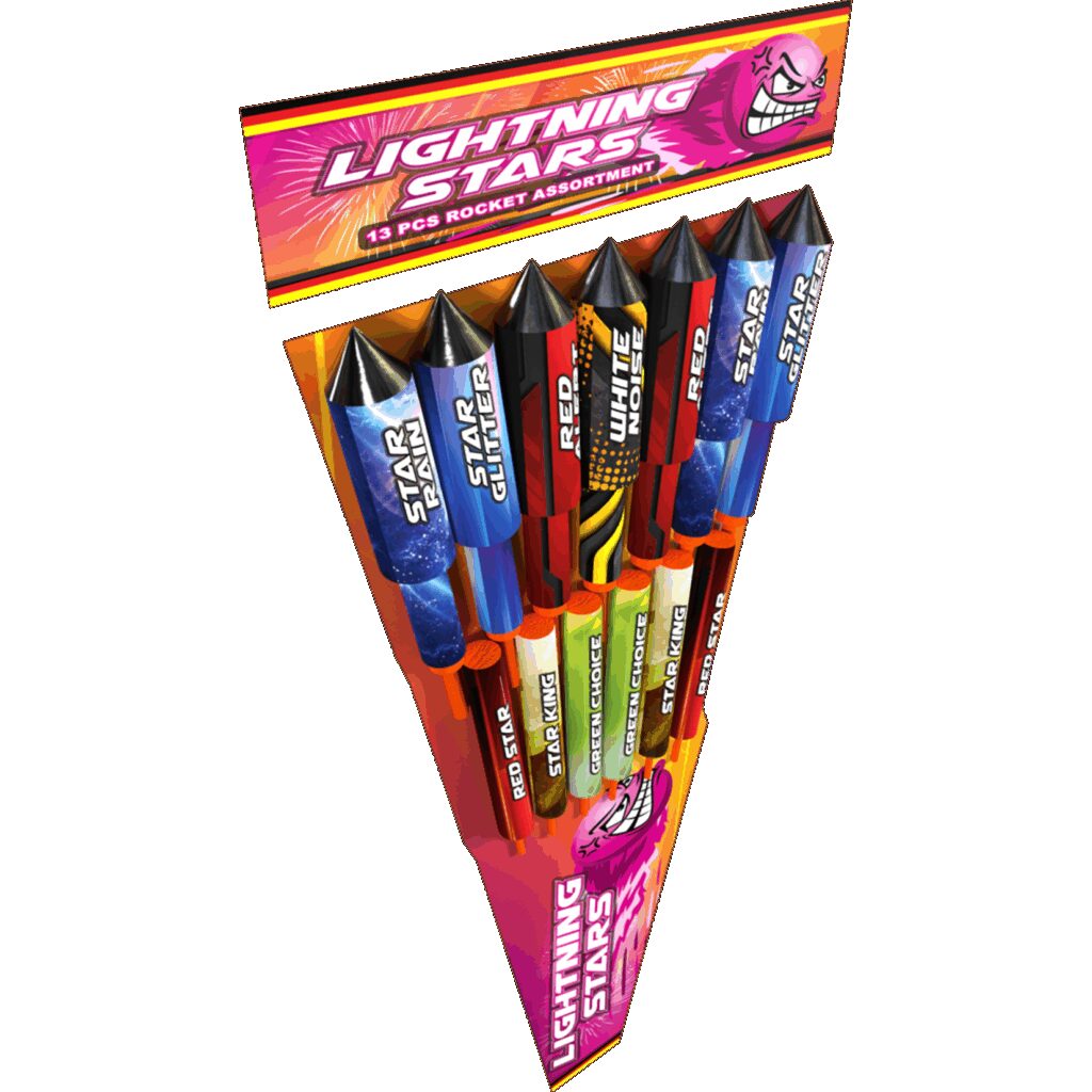 n13 prachtige raketten in 2 formaten en verschillende effecten. Deze raketten veranderen de nacht in Lightning Stars!