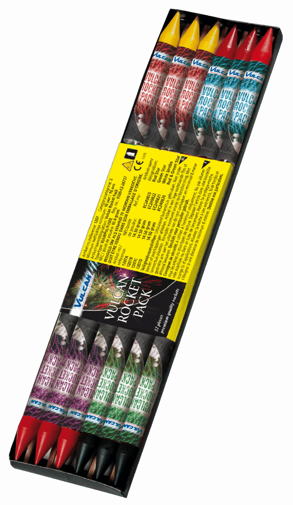 Een assortiment met middelgrote vuurpijlen. 12 stuks gesorteerd in een doos. n nVulcan Rocket pack is een product van Vulcan Europe. nKleine vuurpijlen verpakt in een doosje. n12-delig vuurpijlenpakket met diverse vuurwerkeffecten. n12 vuurpijlen – 4 effecten – 7,7 gr NEC per vuurpijltje Vulcan Rocket pack Goedkoop vuurwerk kopen bij Vuurwerkwinkel Emmerich
